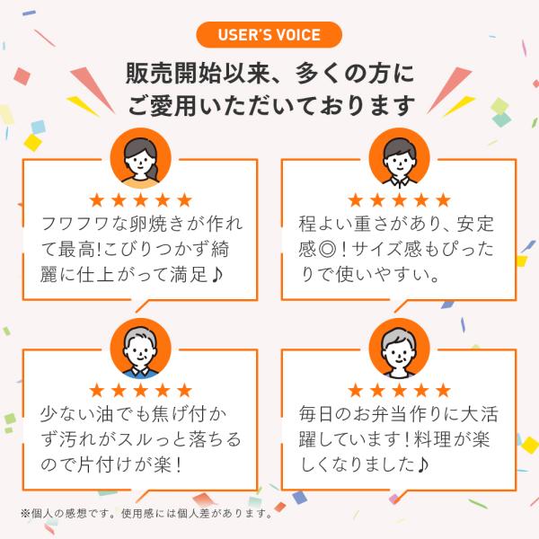底厚約5.2mmで熱が均一に伝わり、調理しやすい玉子焼きフライパン。ふっ素コートで焦げ付きにくくお手入れ簡単!焦げ付いても水を入れるとスルリと落ちやすい。内面4層、外面3層のキズつきにくい多層コートだから、摩耗に強い。