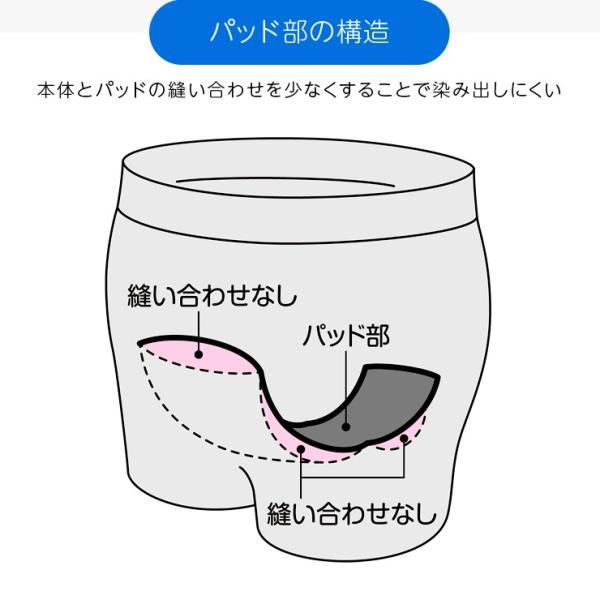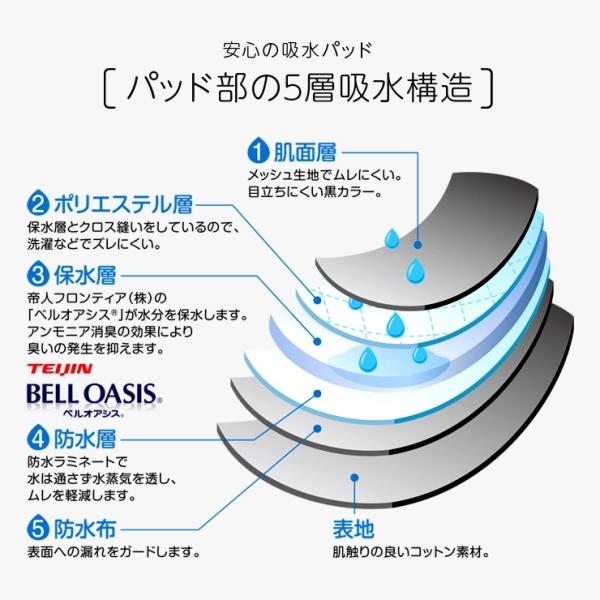 パッド部の5層吸水構造でちょっとした尿漏れが心配な方も安心。不意に力を入れた時に心配な方や排尿後、尿の切れが悪い方におすすめです。外出先、就寝時の漏れ対策に。