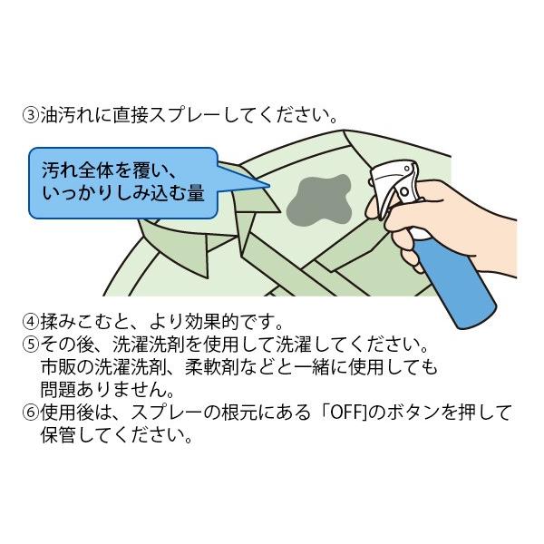 洗濯機に入れる前に油で汚れた衣類にスプレーしてしみ込ませるだけ!他の洗濯物と一緒に洗ってもOKです。作業着、飲食店の調理服やエプロンにも!