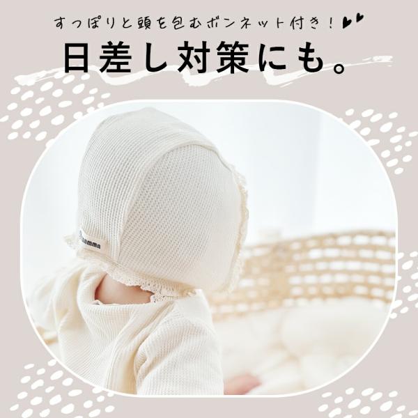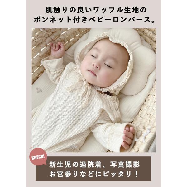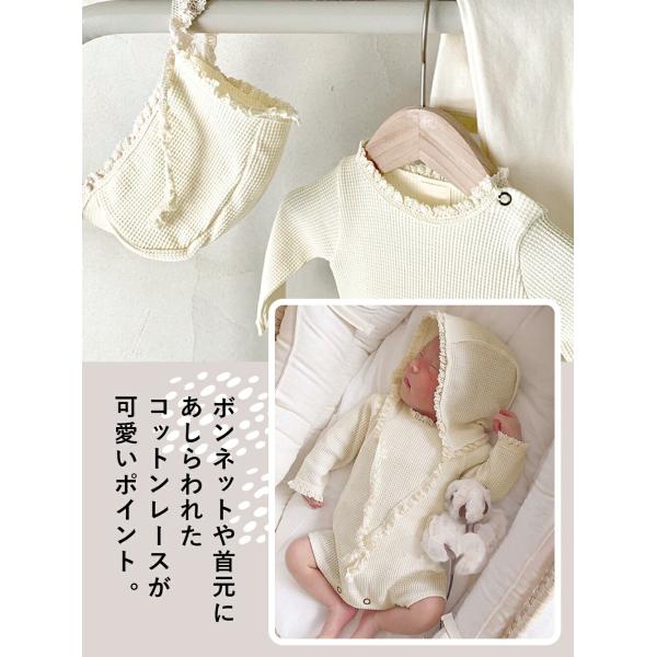 クラシカルなヨーロッパ風デザインが魅力のボンネット付きセレモニードレス。首元とボンネットには繊細なコットンレースをあしらい、おしゃれで上品な印象を演出します。新生児の退院着がメインの用途ではありますが、お宮参り、記念写真など特別なシーンにもぴったりのベビー服です。綿素材のワッフル生地は薄手で柔らかく、通気性・吸水性にも優れたロンパースとしても快適に着用できます。サイズは60〜90cmと豊富で、女の子・男の子どちらにも対応。赤ちゃんの成長に合わせて長く使えるのも嬉しいポイント。ナチュラルで可愛いデザイン、おしゃれでかわいいベビー服。秋冬にはインナーとの重ね着もOKで、通年使えるベビー服としても重宝します。デリケートな赤ちゃんの肌にも安心。快適さを求めるママにも人気。ギフトにもぴったりのベビーウェアです。