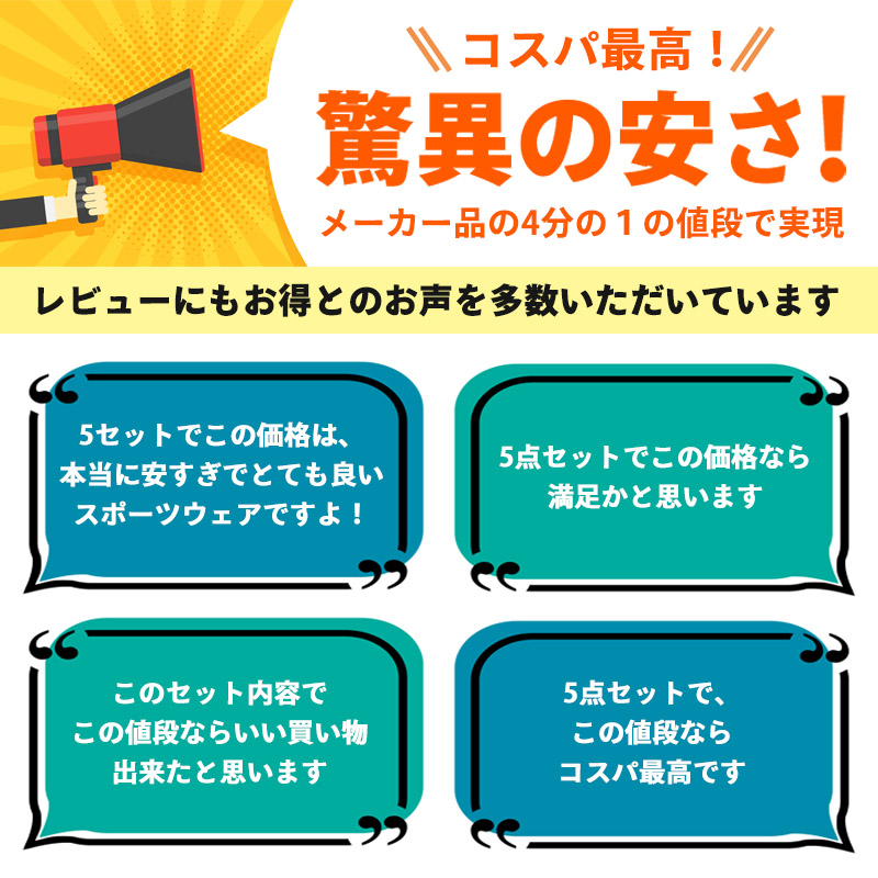 セットで揃う、便利なコンプレッションウェア 5点セット。長袖・半袖シャツ、スポーツタイツ、ハーフパンツが全て揃っており、夏のランニングやジムトレーニング、マラソンなどに大活躍。これ1つで季節や運動内容に合わせたコーディネートが可能です。素材は通気性・速乾性・伸縮性に優れ、汗をかいても快適に過ごせるトレーニングウェア。体にフィットするデザインは、動きやすさとパフォーマンスの向上を実現。スポーツタイツや速乾Tシャツ、ハーフパンツが含まれており、ジムやジョギング、陸上競技やダイエット運動まで幅広く対応。コンプレッションウェアとしての機能性も抜群。夏の暑さでも涼しく快適に運動したい方におすすめのスポーツウェア