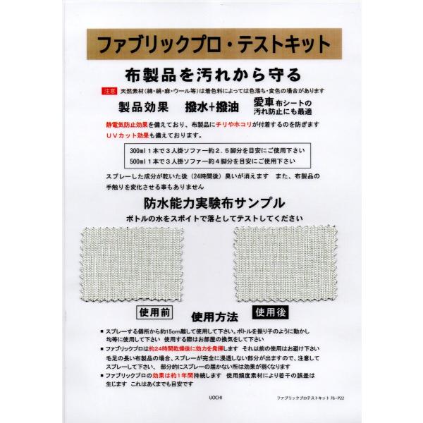 毛足の長い布製品の場合、スプレーが完全に浸透しない部分がでますので、注意してスプレーしてください。届かないところは効果が弱くなります。