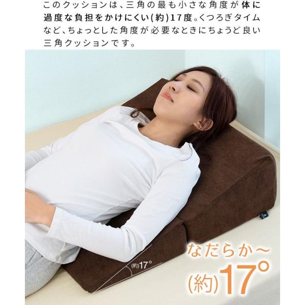 このクッションは、三角の最も小さな角度が体に過度な負担をかけにくい(約)17度。くつろぎタイムなど、ちょっとした角度が必要なときにちょうど良い三角クッションです。