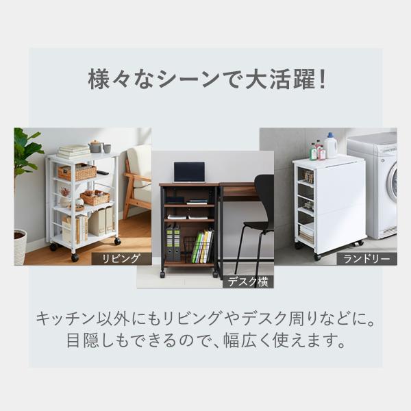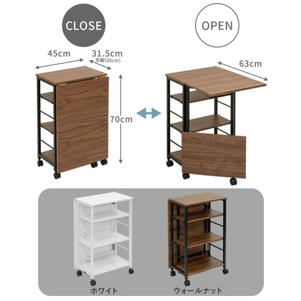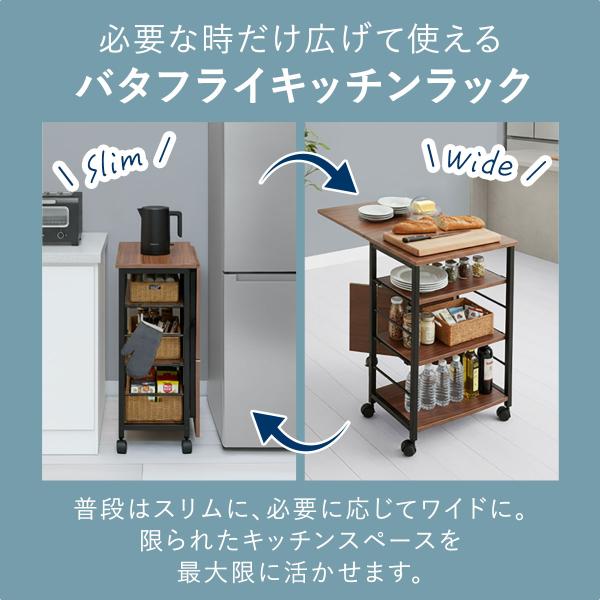 天板拡張で作業台になる、バタフライ式キッチンワゴン。机と組み合わせやすい高さ70cmサイズで、キッチン以外にもリビング・ランドリー・デスク周りなどにも。背板にもなる折りたたみ天板は、目隠しにもなりスッキリした収納を実現します。