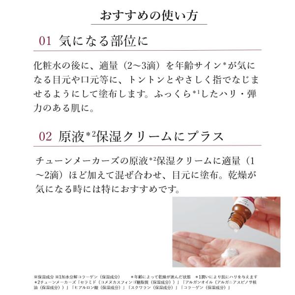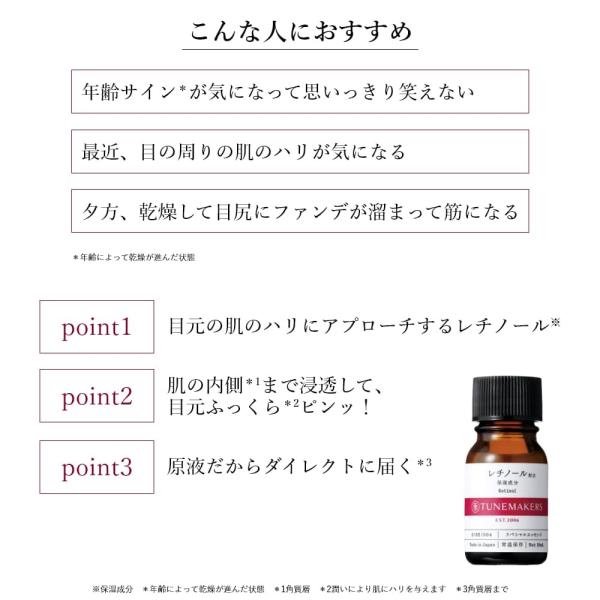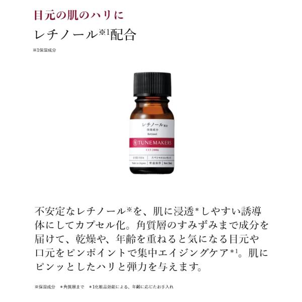 不安定なレチノールを、肌に浸透しやすい誘導体にしてカプセル化。角質層のすみずみまで成分を届けて、乾燥や、年齢を重ねると気になる目元や口元をピンポイントで集中エイジングケア。肌にピンッとしたハリと弾力を与えます。目元の肌のハリにアプローチするレチノールビタミンAの一種で、アイクリームなどにも配合されることが多い成分。年齢を重ねると気になる目元の年齢サインを集中ケアします。肌の内側まで浸透して、目元ふっくらピンッ!不安定なレチノールを肌に浸透しやすい誘導体にして、さらにカプセル化。ダブルの安定化により、肌の内側までしっかり届け、目元にふっくらしたハリ感と弾力を与えます。原液だからまっすぐ届く化粧品の原料に使われる成分そのままをボトルに詰め込みました。余分な成分を含まないから、肌にまっすぐ届きます。