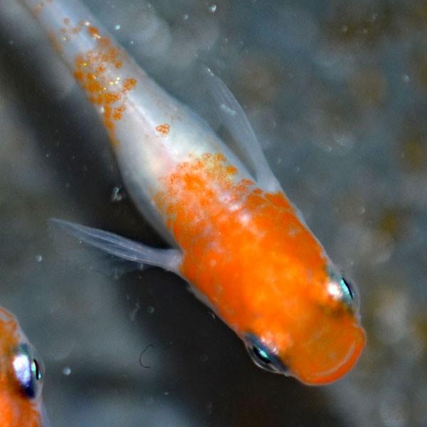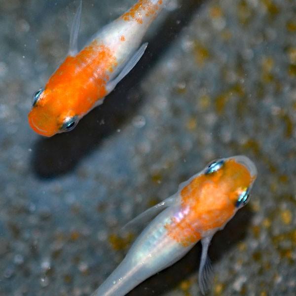 紅白の体色のみゆき(幹之)めだかです。親めだかは体外光ですが、体外光の光が出なかった個体になります。模様は個体により異なります。