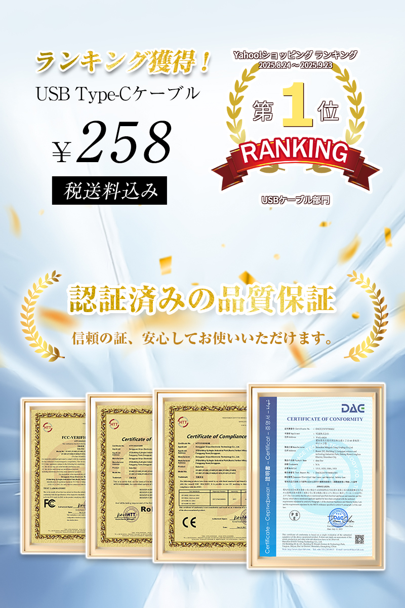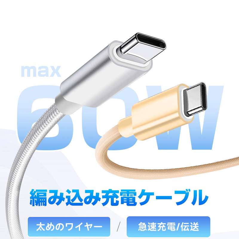 USB Type-Cポートを持つ端末とパソコンを接続してデータ転送をしたり、USB充電器と接続して端末の充電をしたりするときに使用するケーブルです。