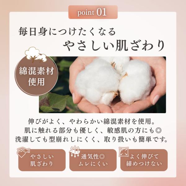 綿なので通気性に優れサラサラの肌触りで腹をすっぽり包むハイウエストは夏のクーラーや冬の冷え対策に最適、締め付けすぎず快適な履き心地です。