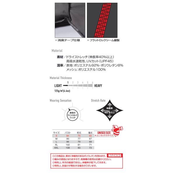 ・素材 :クールストレッチ(伸長率40%以上)、吸汗速乾加工、UVカット(UPF45)