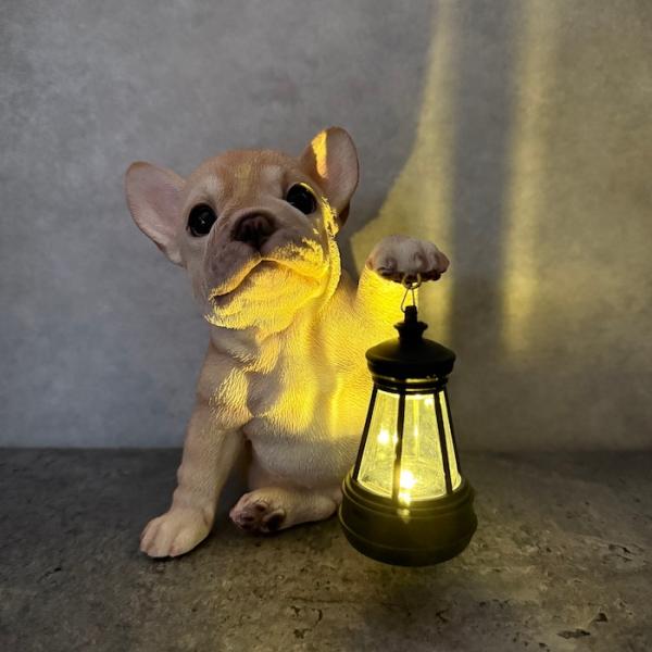 ソーラーランプを持ち上げるフレンチブルドッグが、玄関や庭にぬくもりを灯します。