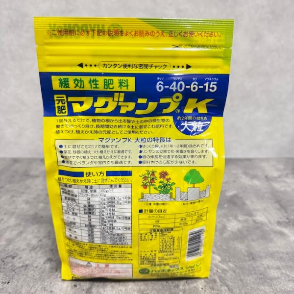 マグァンプK 大粒は、土に1回混ぜ込むだけで約2年間効果が持続する緩効性の化成肥料です。