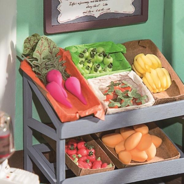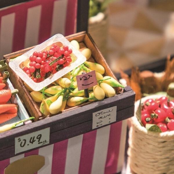 「つくるんです DG142 フルーツショップ」は、旬の果物や野菜が彩るフルーツショップを再現するミニチュアハウスのDIYキットです。