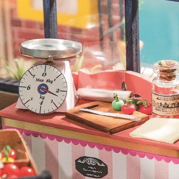 レジスターや計量器など、細部までこだわった小物もそろい、組み立てる過程から完成までじっくり楽しめます。