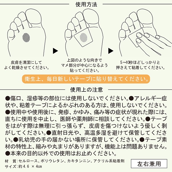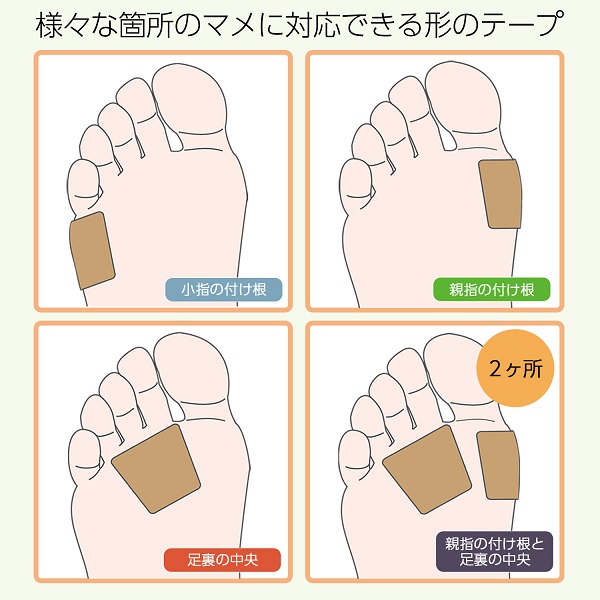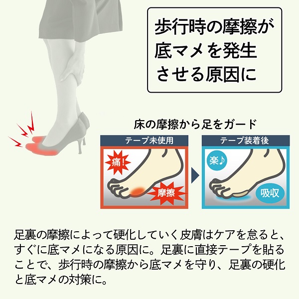 足裏に直接テープを貼ることで、歩行時の摩擦から底マメを守り、足裏の硬化と底マ メの対策にオススメです。