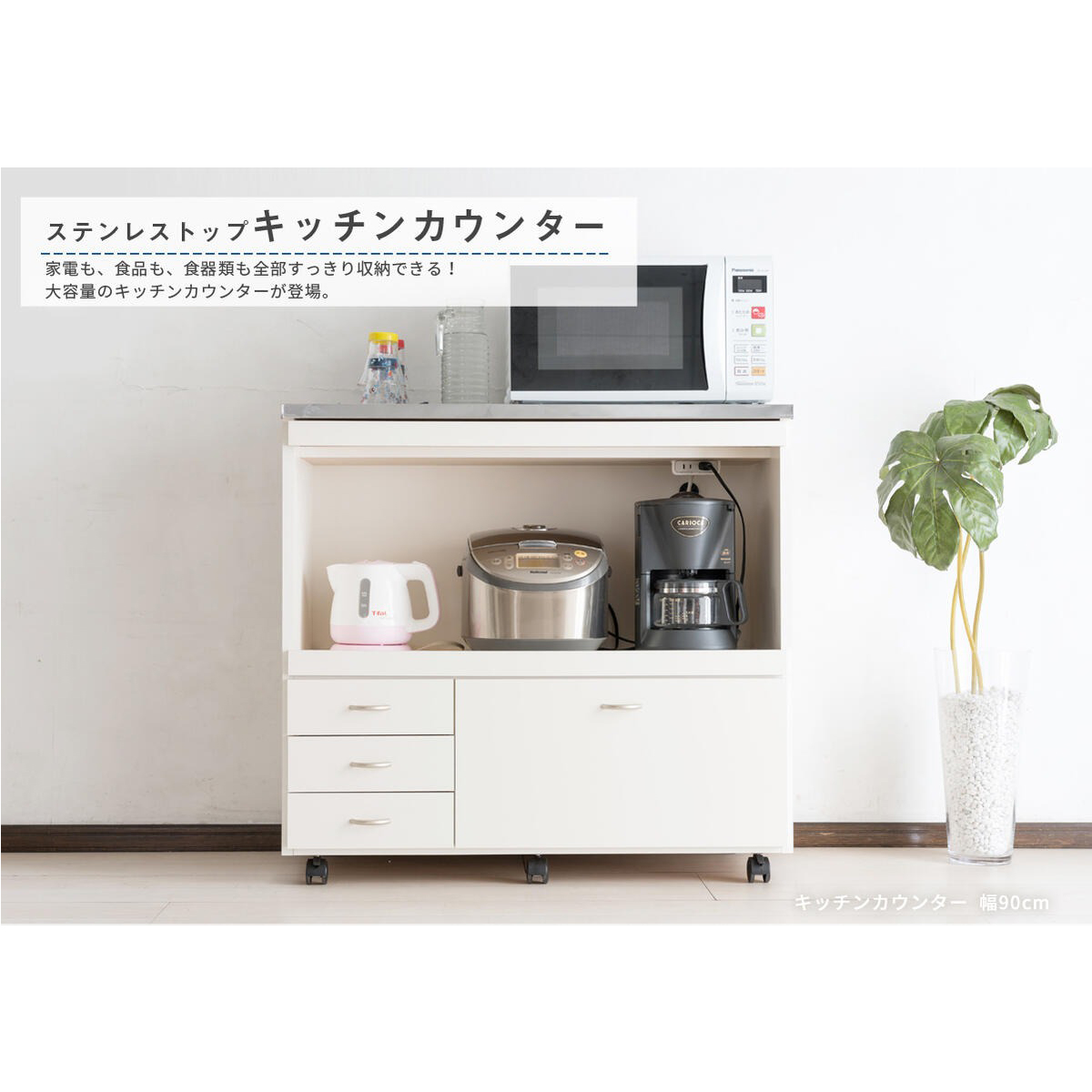 キッチンカウンター 90幅 完成品 間仕切り 背面化粧 ステンレス天板 キャスター付き 収納 奥行44 高さ85 爆買
