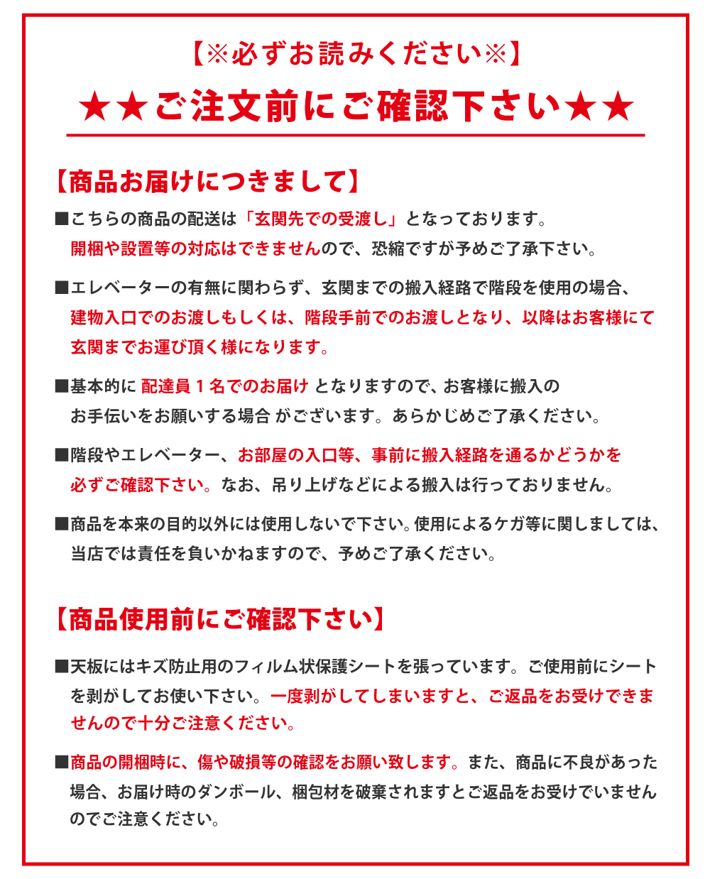 ■こちらの商品は「玄関先での受渡し」となっております。開梱設置等の対応はできません。