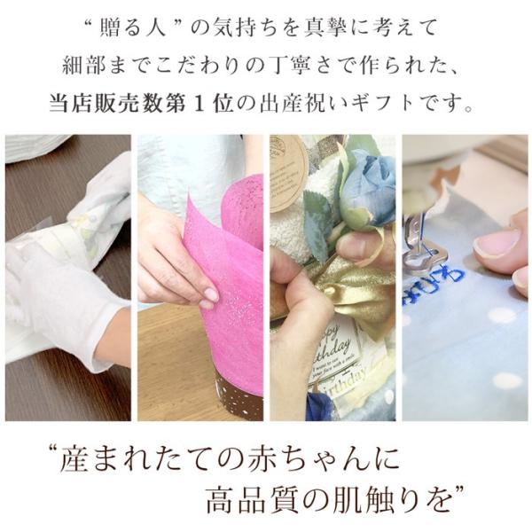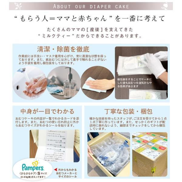 良質で安全な製品を用いて作ったハンドメイド風の暖かみのあるハイセンスなおむつケーキです。