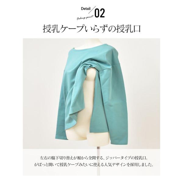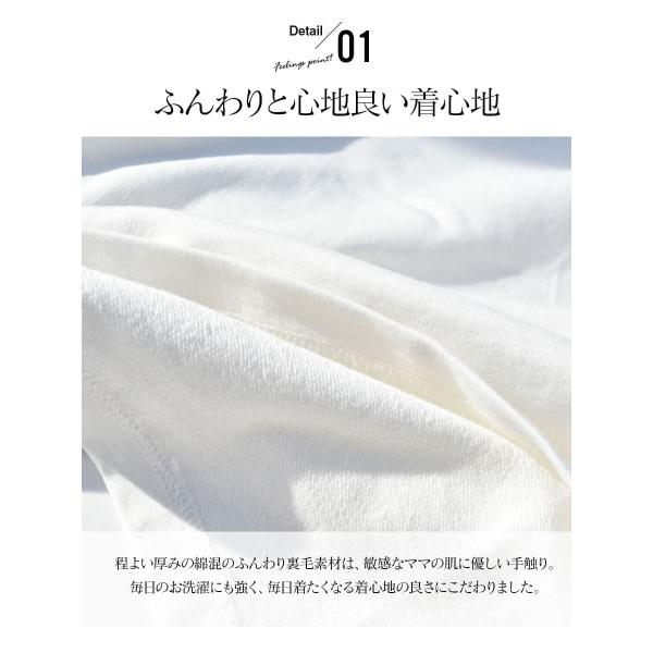 シンプルでベーシックな授乳トップスはは、程よい厚みのふんわり裏毛生地を使用。通年使えるとっても軽い着心地が魅力。