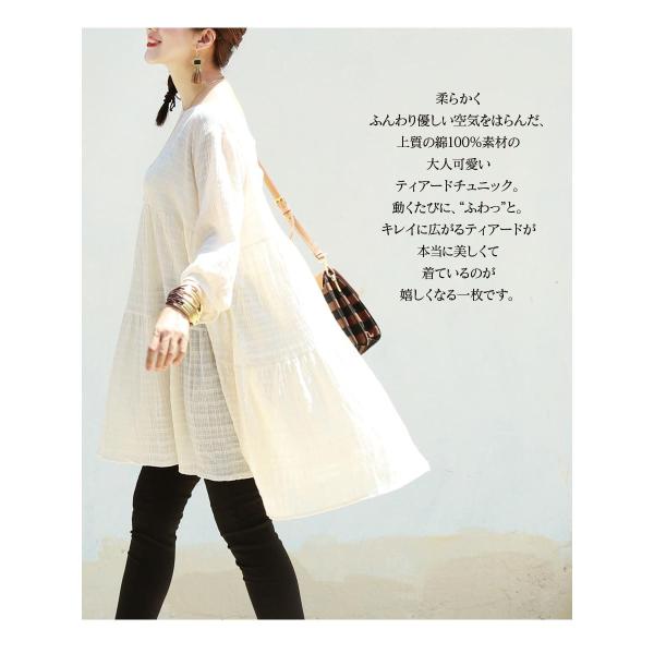 着映えするティアードシルエットが女性らしいふんわり感を演出する、上質な綿(コットン)100%のチュニックです。