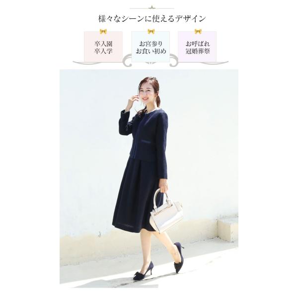 ジャケット&ワンピースのセットでの着用ではもちろん、それぞれのアイテムでも使え、卒入園・卒入学などのイベントや、お宮参り、お食い初め、オフィスにと様々なシーンでお使いいただけます。