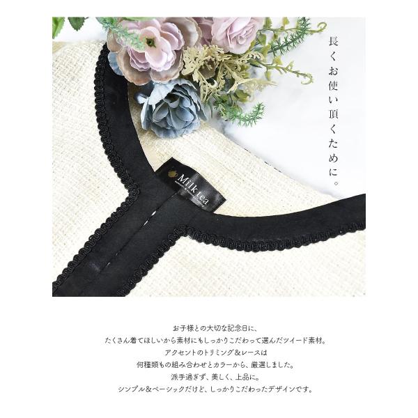リッチで上質なツイード素材に美しいトリミング&リボンレースをあしらった上品なセレモニースーツ2点セットです。