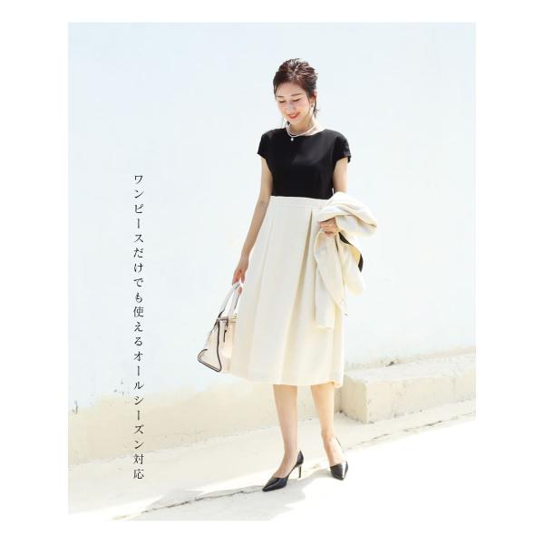 また、ワンピースはトップス部分に伸びの良いジャージー素材を使い着心地抜群。袖は二の腕がすっきり見えるフレンチスリーブに。