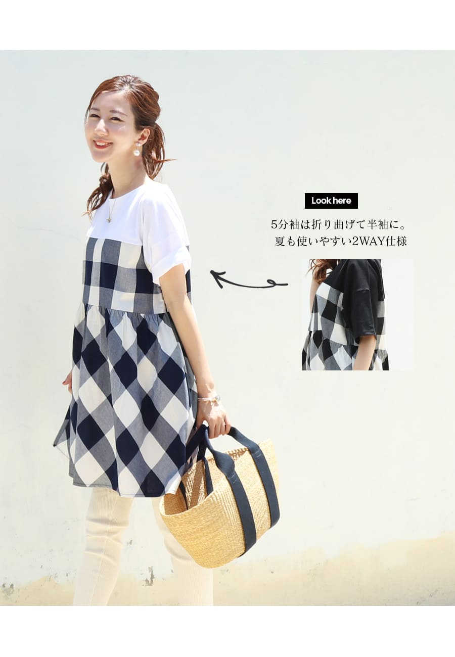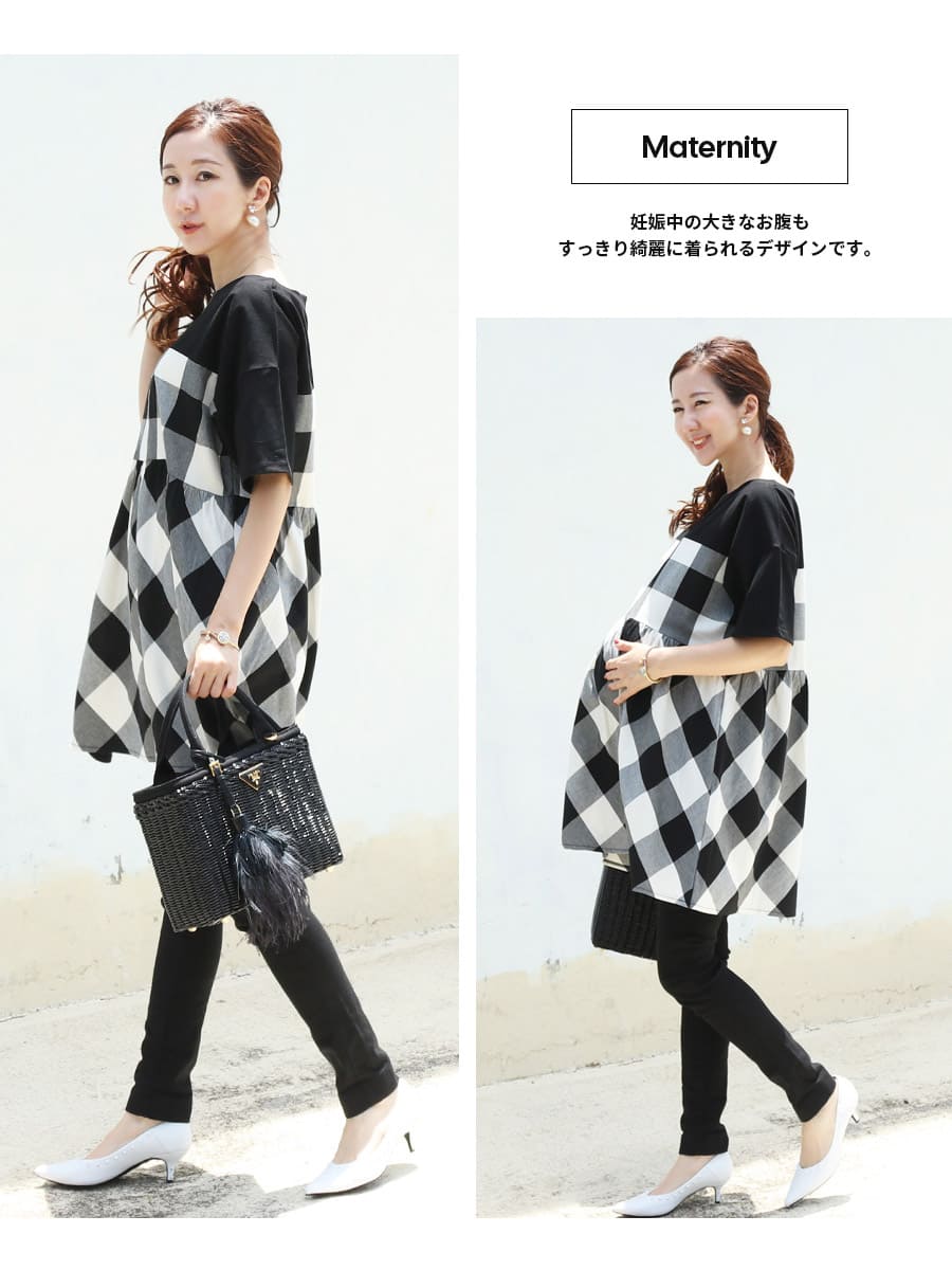 マタニティ 服 授乳服 ルネ・バイカラー半袖フレアーチュニック ジッパータイプ マタニティウエア トップス チュニック 綿 コットン チェック