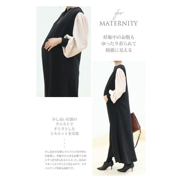 少し高めの位置にウエストの切り替えを配置し、妊娠中の大きなお腹でも楽にすっきり着られるシルエット。