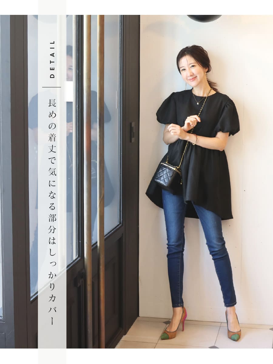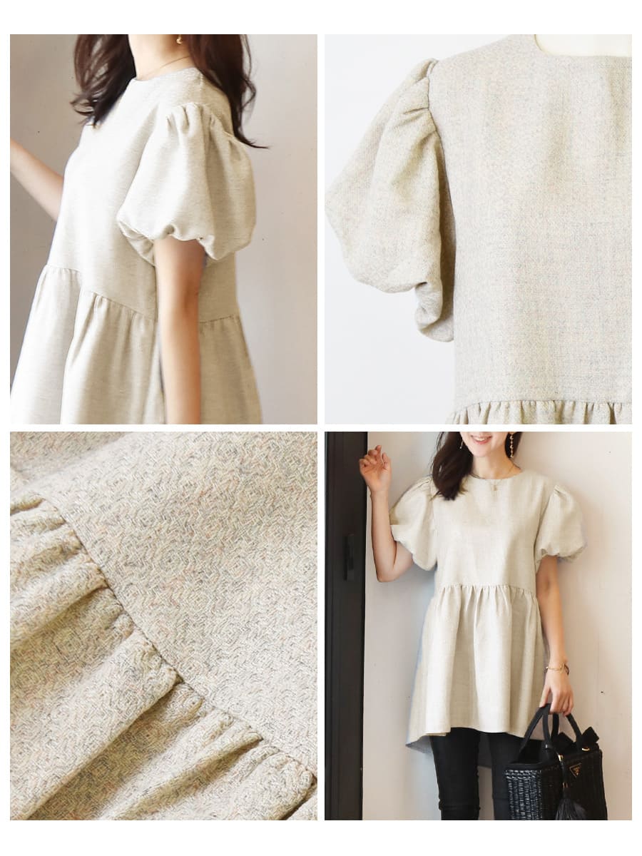 ぷっくりした立体的なパフ袖が柔らかなシルエットを作り、胸下の切り替え部分に入れたギャザーが、綺麗で愛らしいペプラムシルエットを実現。