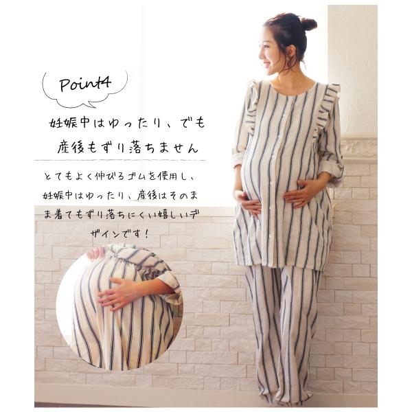 メンズライクなストライプ柄と、甘いフリルのディテールが絶妙に可愛くておしゃれな産前産後兼用パジャマ。