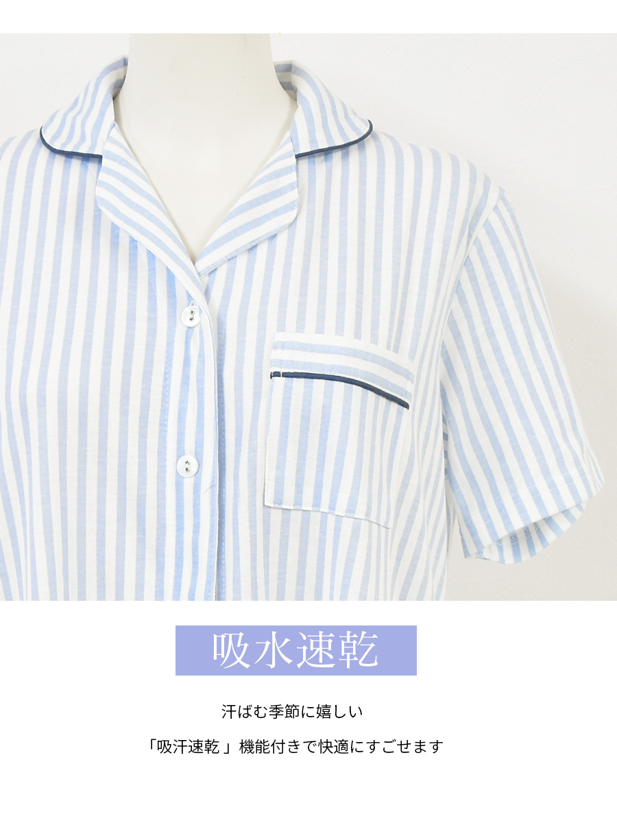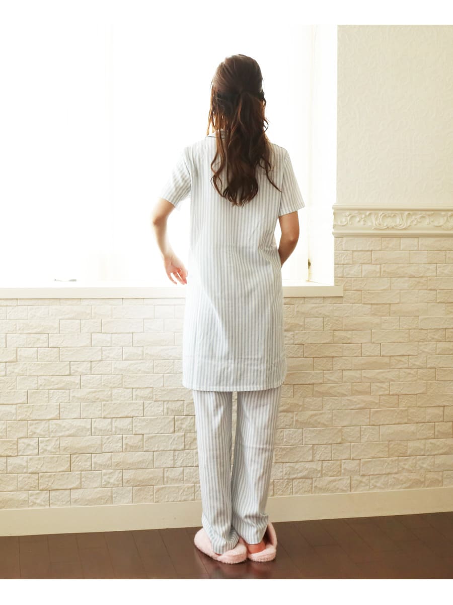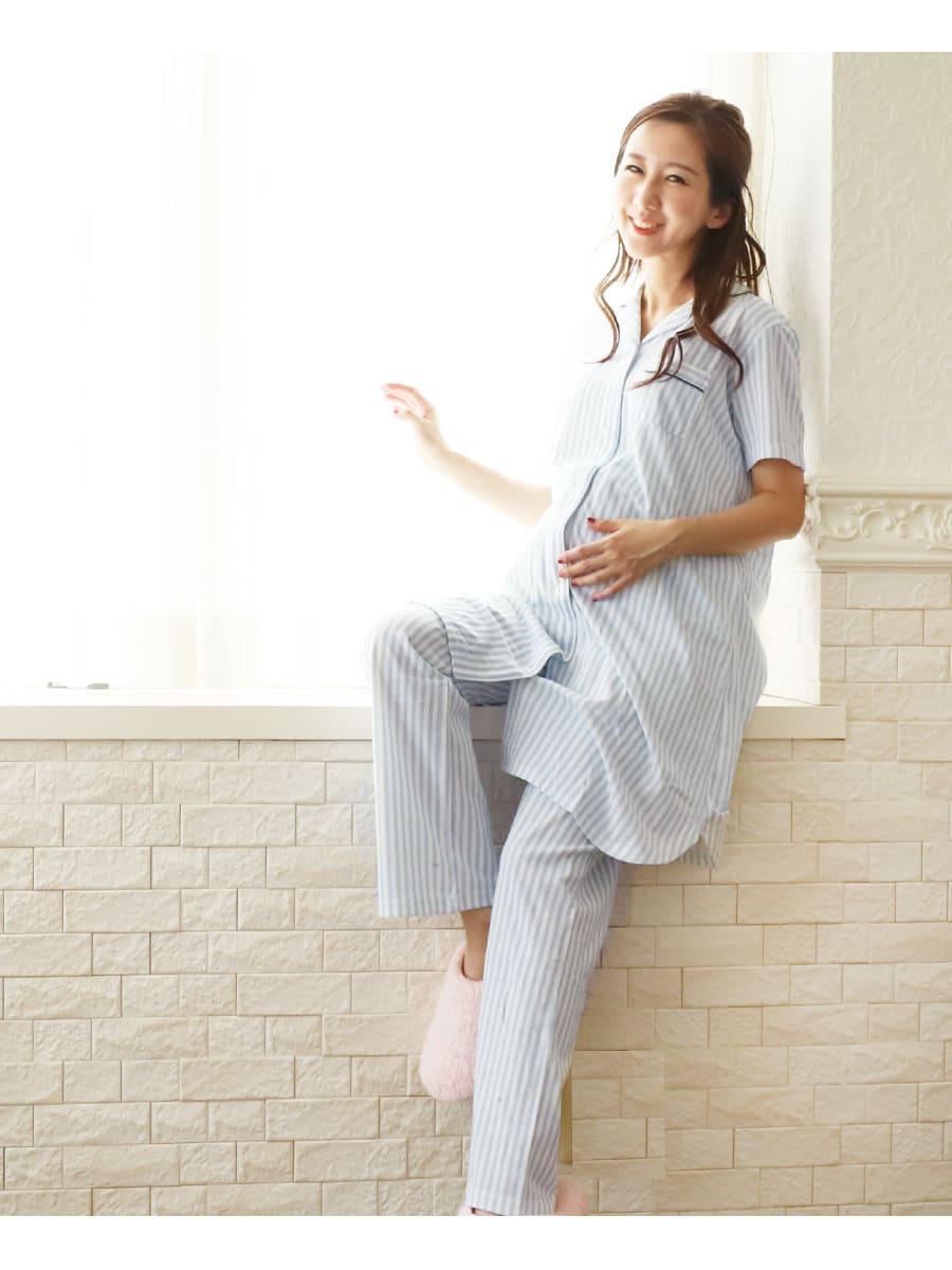 マタニティ 服 授乳服 吸汗速乾快適ストライプカットソー半袖パジャマ【585925】 スナップボタンタイプ 妊娠 出産 産前 産後