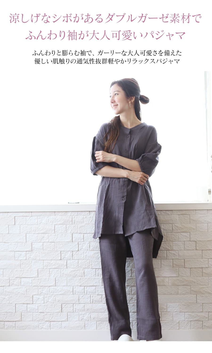 涼しげなシボのあるダブルガーゼ素材で優しい肌触りの通気性抜群軽やかリラックスパジャマ。