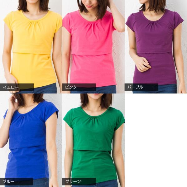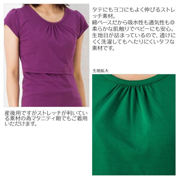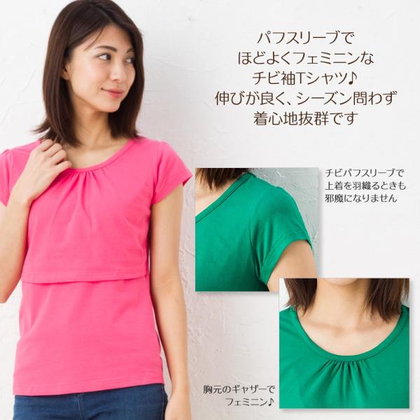 授乳服 ストレッチ天竺チビ袖パフスリーブ Tシャツ トップス 産後 母乳育児服 授乳 インナー 半袖 丸首 クルーネック 授乳期から卒乳後まで【ST】