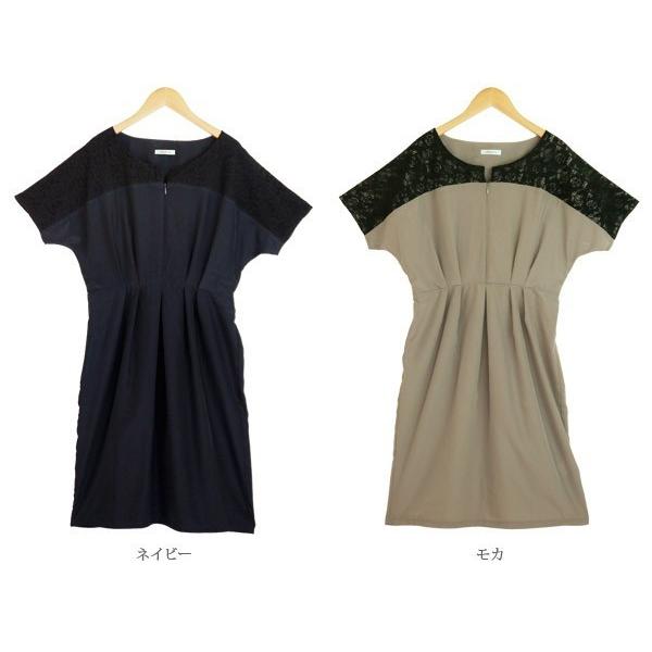 ショルダーにあしらったレースが大人なエレガントさを演出できるワンピース。<br><br>ブラックのレースが甘すぎない絶妙な仕上がり。<br><br>若干の高めウエスト切替と適度なヌケ感のあるシルエットがおしゃれに体型カバーできます。<br><br>肌寒い季節にはインに授乳インナーでレイヤードスタイルも楽しめます。<br><br>ちょっとしたお出かけにピッタリなワンピースです。<br><br><br><br>《サイズ》<br><br>サイズ/着丈/胸幅/裾巾/裄丈<br><br>M/96/45/51/40<br><br>L/98/50/54/41<br><br>※実寸は商品によって若干の誤差が生じる場合がございますのでご了承下さい。<br><br><BR><br>【TYPE】<br><br>普通<br><br>【素材】<br><br>ポリエステル100%<br><br>【取り扱い】<br><br>手洗い・ドライ(石油系) ○・アイロン(低)・乾燥機 ×<br><br>中国製<br>