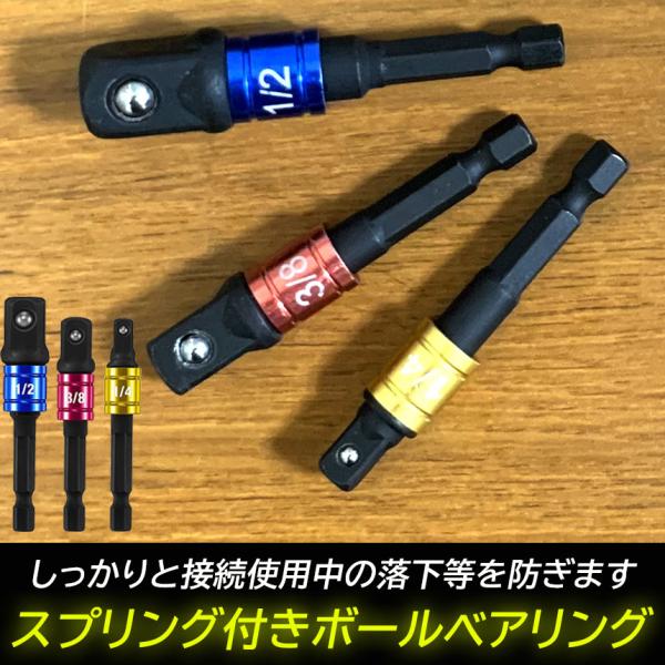 【軸径】 : 6.35mm六角軸。電動ドリルドライバーの六角チャックに取り付け、105°L型アダプター&3種類のソケットレンチシリーズを取り換えることができ、大変便利に使っています。カラーリングでサイズが一目でわかる。