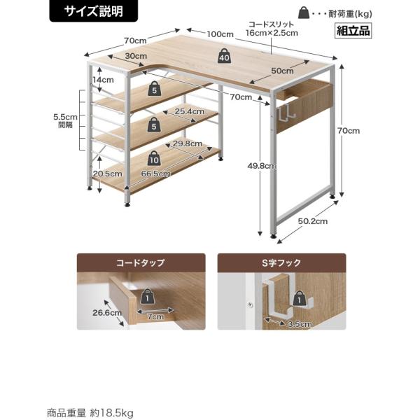 耐荷重:天板:40kg・可動棚:3kg・固定棚:10kg・コードタップ収納:1kg・S字フック:1kg