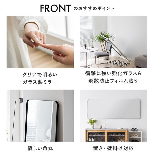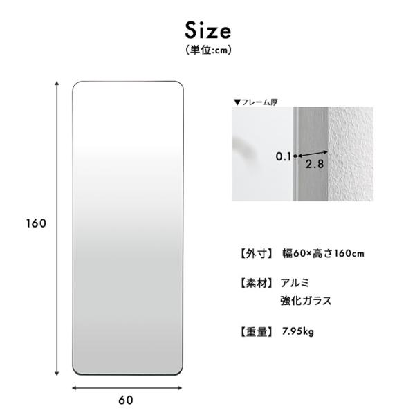 鏡 スタンドミラー 姿見 全身鏡 おしゃれ 長方形 60x160cm ミラー 全身ミラー かがみ 壁掛け アルミ製 ガラス Front(フロント) 5色対応