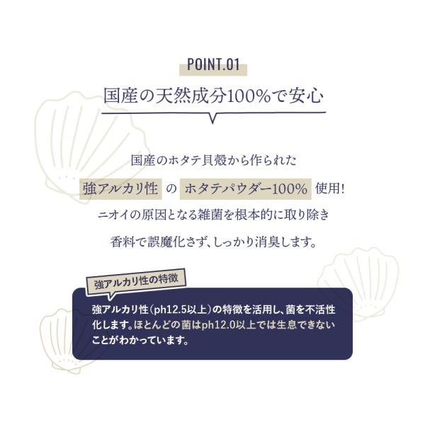 国産の天然成分100%で安心!カビも抑制!においが消えた後は半年ほど持続します。効果は藩ホタテの貝殻から作られた画期的な商品。においの原因となる雑菌を根本的に取り除きます。