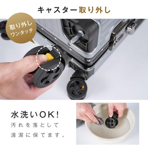【キャスター取り外しOK!】取り外しがワンタッチで、工具不要!キャスターが破損しても簡単に交換でき、スーツケースを長くご愛用いただけます。水洗いOK!汚れを落として清潔に保てます。