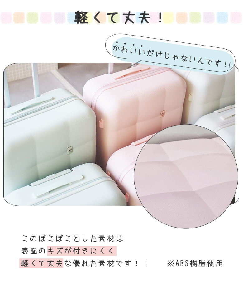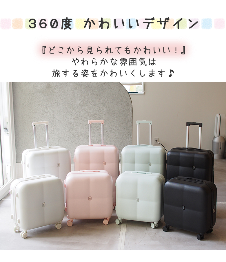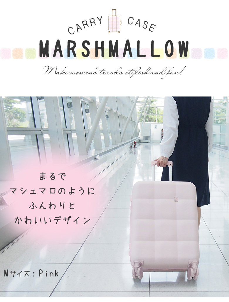 スーツケース / キャリーケース / キャリーバッグ / ダブルキャスター / 4輪 / TSAロック / TSA / 大型 / 1泊 / 2泊 / 3泊 / 旅行 / 修学旅行 / 留学/ 合宿 / 卒業旅行 / 入院 / 引越し / 女子高生 / レディース / 女性 / 軽量 / 軽い / 前面ファスナー / マシュマロデザイン / シンプル / かわいい / マシュマロデザイン / パステルカラー / マカロンカラー / Sサイズ / Mサイズ / S / M / 黒 / ブラック / 白 / ホワイト / ピンク / 水色 / ブルー