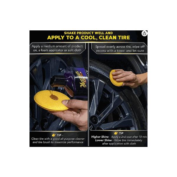 Meguiar's独自の配合により、タイヤが茶色に変色するのを防ぎ、オーバースプレー、滴、筋などを取り除きます。豊かな輝きを放つ高級成分配合。雨の中でも数週間持続します。日常使いに最適。