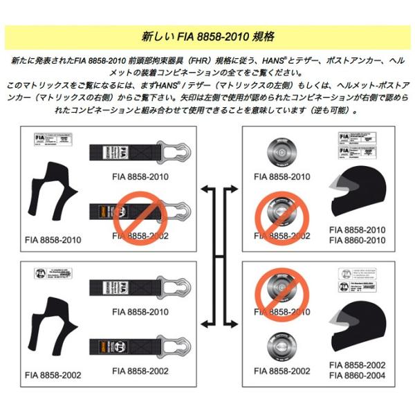 注意:本商品は新規格「FIA8858-2010」対応品のため旧規格「FIA8858-2002 (8860-2004含む)」対応のヘルメットには取付出来ませんのでご注意下さい。尚、FIAレギュレーション変更によりこの2010規格は公認ステッカーはなくなりました。