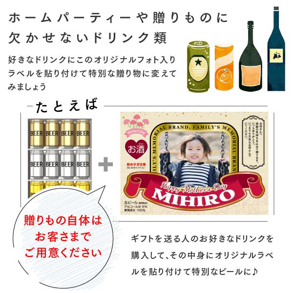 こちらの商品はラベルのみの販売となります。お好きな写真をお送りいただき作成したラベルをお好みの飲み物などに張り付けしてプレゼント・サプライズ・ジョークグッズとしてご利用ください。例えばお子さまの写真を入れてママにプレゼント、お孫さんの写真を使ってばぁばにプレゼント、仲良しメンバーの写真を使ってパーティーグッズなど、様々な用途にご利用いただけます♪ただ、このラベルは生活耐水となりますので、冷蔵庫での保冷1回分を想定しております。常温と冷温を何度も繰り返すと品質が劣化してしまいますのでご注意ください。