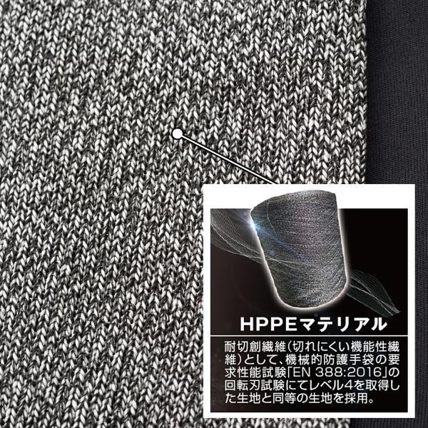 耐切創繊維(切れにくい機能性繊維)として、機械的防護手袋の要求性能試験「EN 388:2016」の回転刃試験にてレベル4を取得した生地と同等の生地を採用。