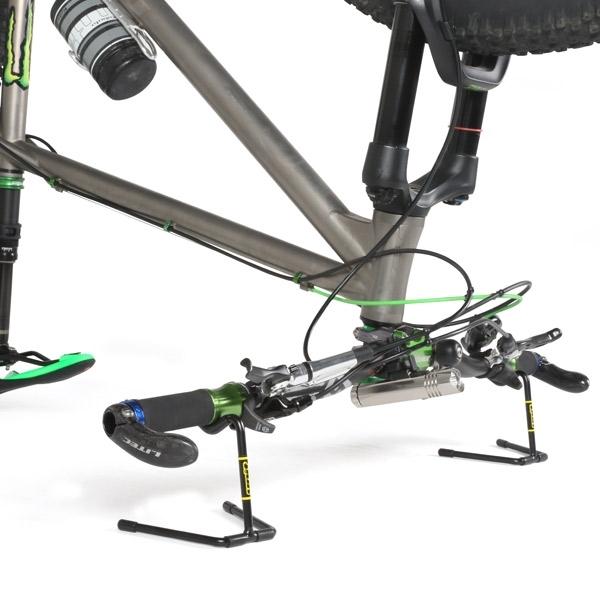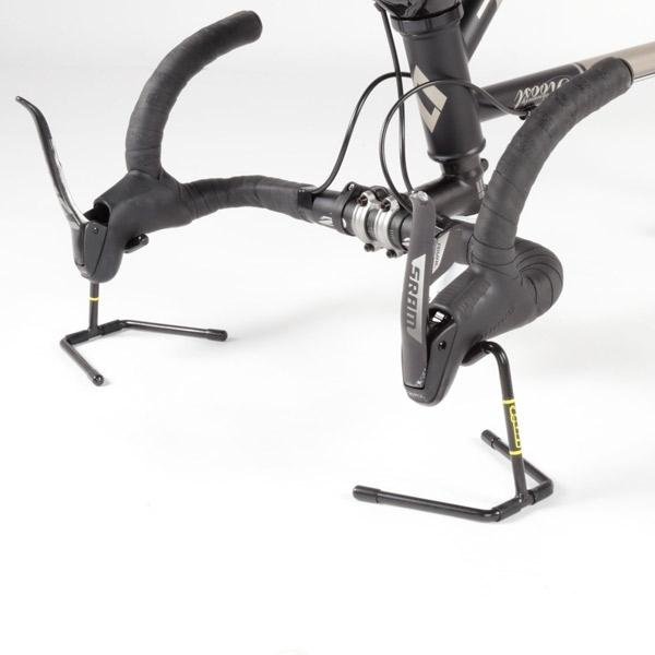 バイクを逆さまにしてメンテナンスする際に便利な専用スタンド。地面から約100mmハンドルを浮かすことで、ライトやサイクルコンピューターの干渉を防止。