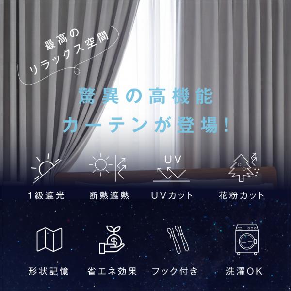 【さらに嬉しい多機能カーテン】フックはあらかじめカーテンにセットされた状態で梱包されています。だから面倒な取り付け作業は不要!届いたらすぐにご使用いただけます。高密度編みの生地は耐久性はもちろん、シルクのような質感に高級感のあるドレープが見た目も上品に映えます。