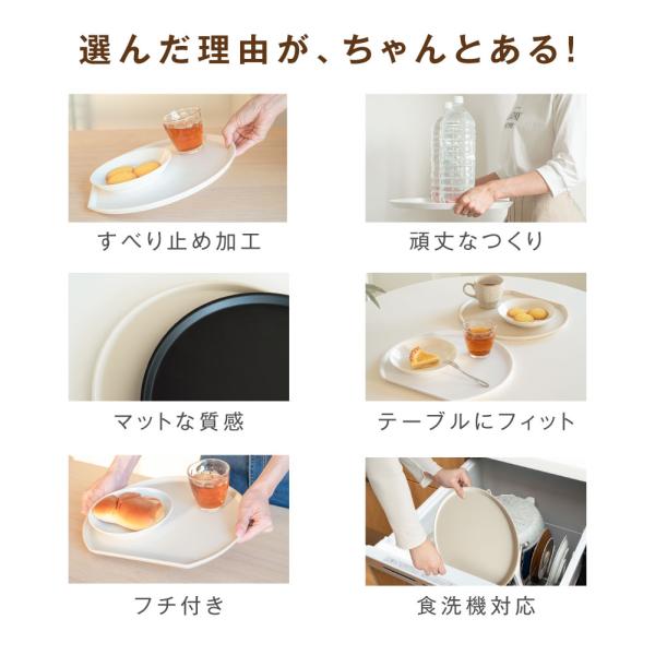 【フチが付いてより安心!】厚さ1,5/1.7cmのフチが付いて、料理を運ぶときも指がかけられ安心できます。テラスランチも気軽にできて◎すべりにくい表面加工を施して、お盆が斜めになっても食器がすべりにくく食卓へ安全に運ぶことができます。
