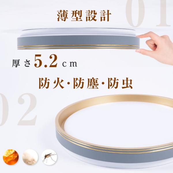 【製品仕様】商品サイズ:約Φ50xH8cm/カラー:グレー+ゴールド /適用畳数:14畳/調色:12段階/調光:12段階/消費電力:48W/定格光束:5700lm/色温度:3000〜6000k/重量:約1.7kg