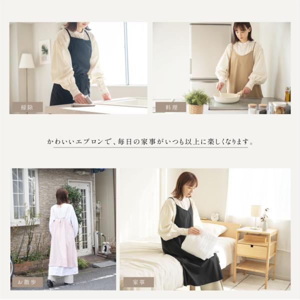 【肩紐長さ調節可能/2つのサイドポケット付き】肩紐は長さ32cmから自由にロング調節可能。かぶるだけの脱着は気軽で首が疲れない。肩紐も捻じれにくく、左右にループするため引っ張り感が抑えられます。全身すっぽり覆われて締め付け感もなく、体型カバーも期待できます。2つのサイドポケットはスマホやペン、レシピなどの小物を入れるのに便利です。