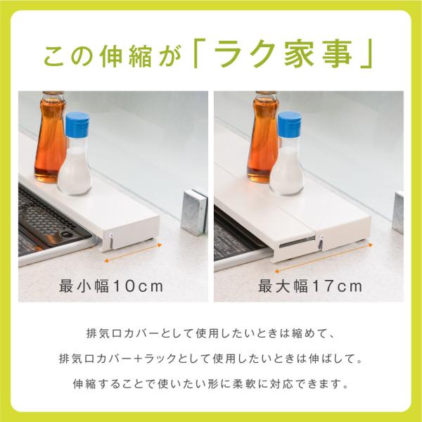 【奥行伸縮】簡単に伸縮できて、 好きな長さに調整可能。振行きは約10~17cmの間で自由に伸縮できるので。取り外すことなく、スライドさせるだけで便利に使えます。 までの行きから気口まで汚れを防止できます。